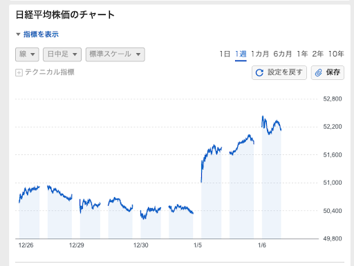 6日も続伸し、5万2,200円付近まで上昇しています。
